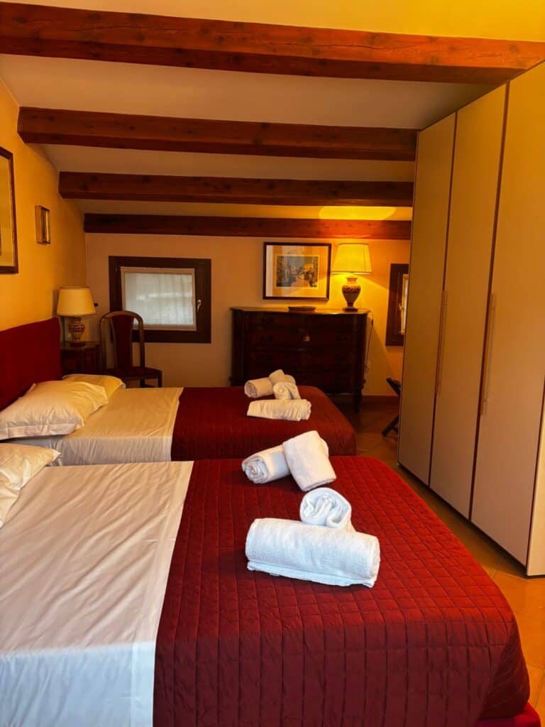 La zona notte è distribuita nei piani superiori e offre due camere spaziose e confortevoli. La prima è dotata di un comodo letto matrimoniale, mentre la seconda dispone di due letti queen size, ideale per famiglie con bambini. Entrambe le camere godono della comodità di un bagno ensuite privato, così ognuno potrà contare sul proprio spazio e sulla propria privacy. A completare la casa, un ulteriore bagno di servizio situato al piano terra.