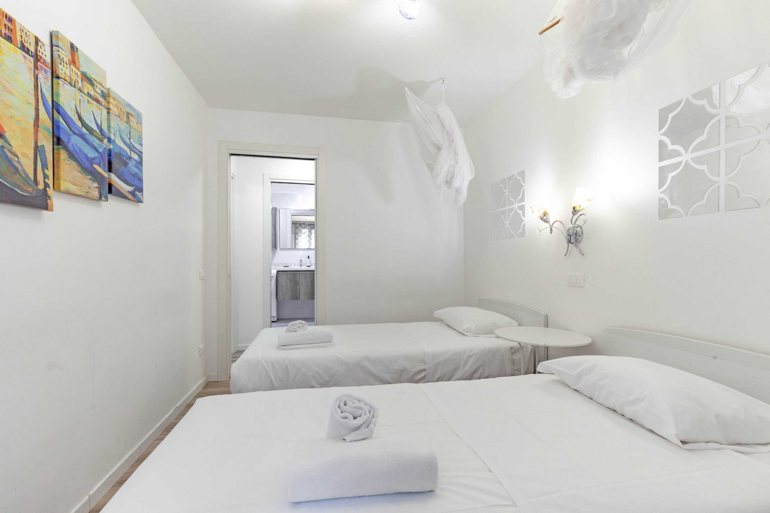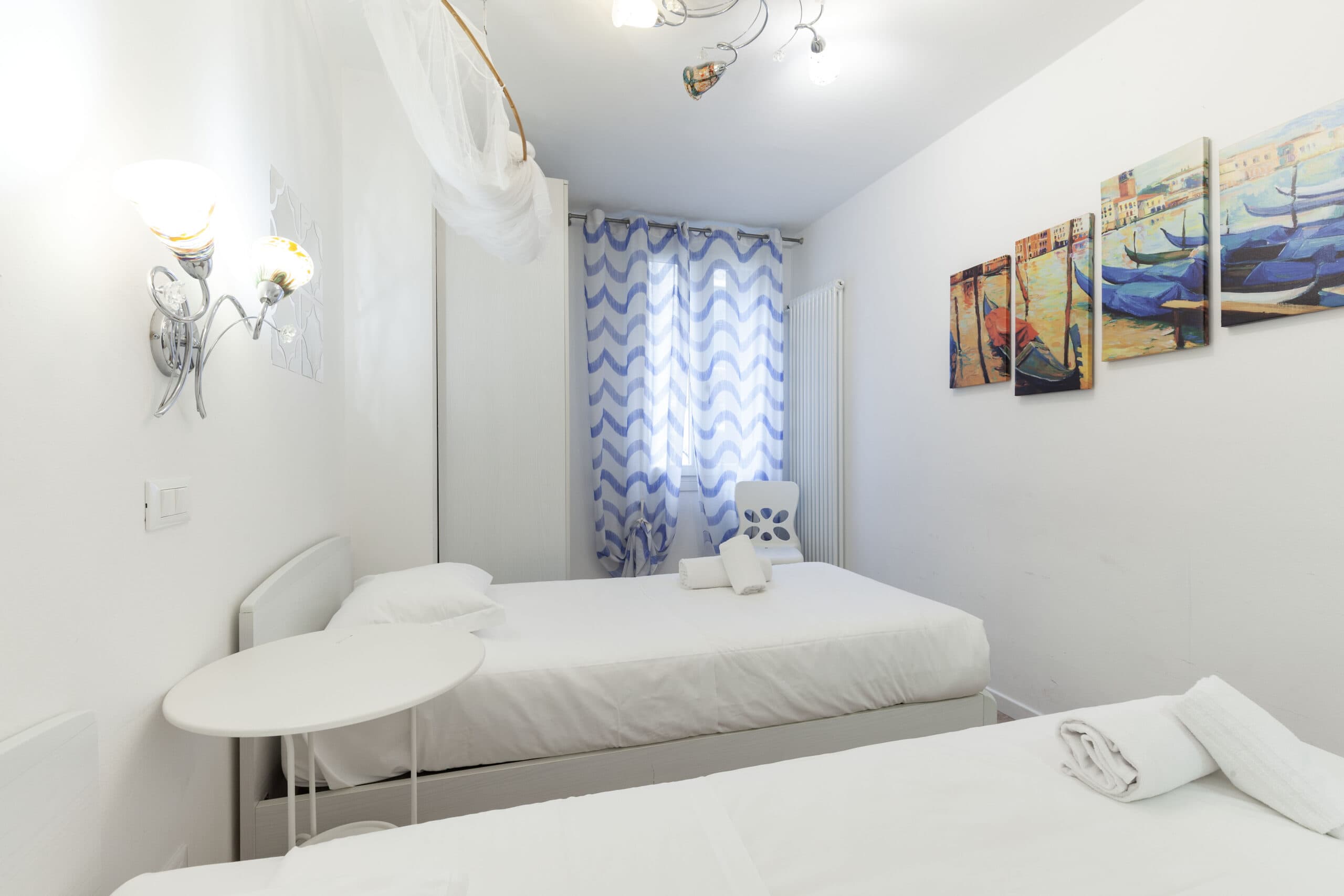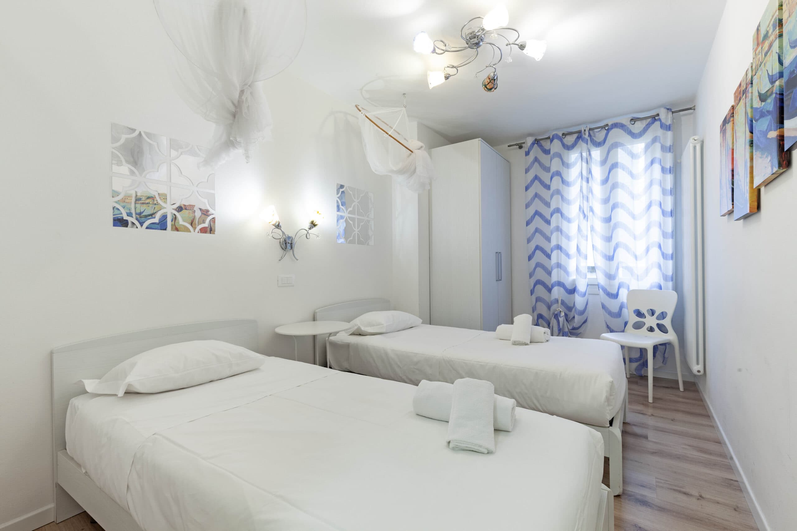 The apartment offers two bedrooms: a bright and elegant master bedroom, and a second bedroom with two single beds, perfect for friends or families. Both rooms are simply furnished with great attention to comfort, and include linens and thoughtful details that create a warm and welcoming atmosphere.
