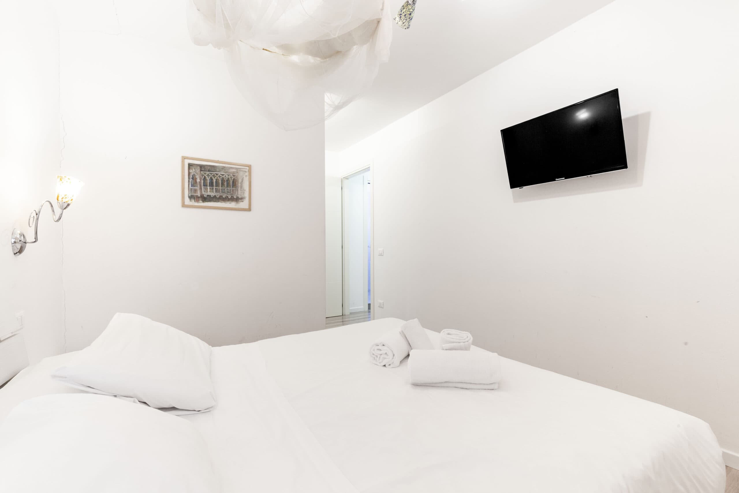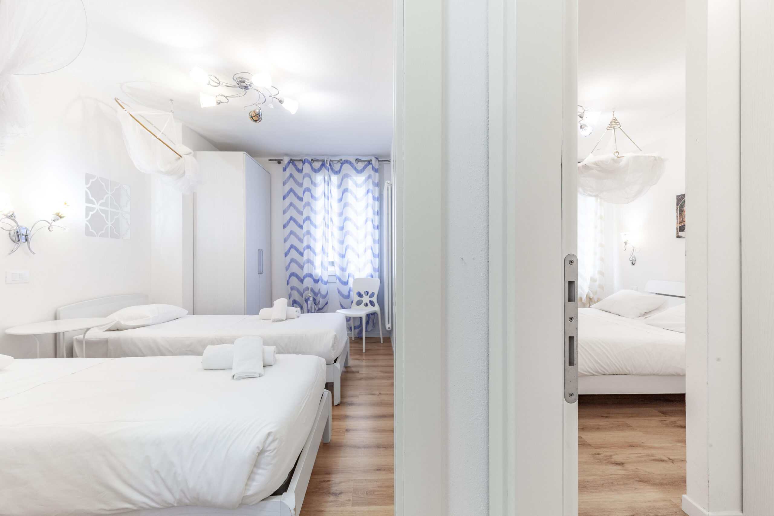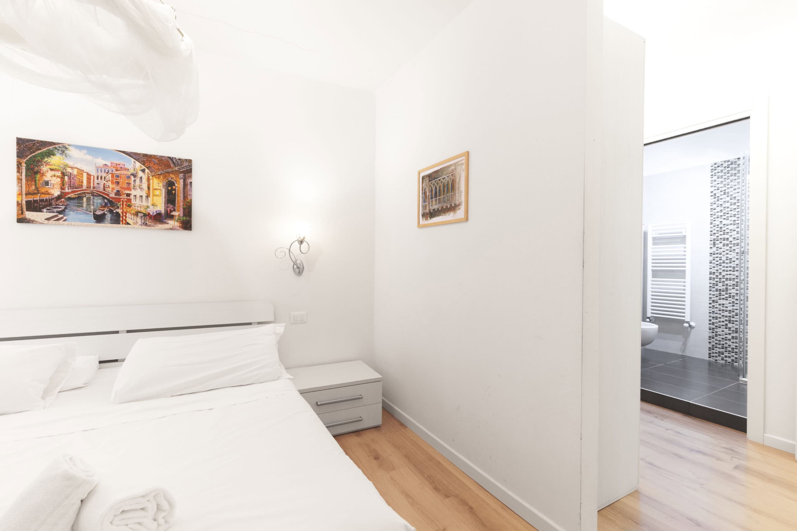The apartment offers two bedrooms: a bright and elegant master bedroom, and a second bedroom with two single beds, perfect for friends or families. Both rooms are simply furnished with great attention to comfort, and include linens and thoughtful details that create a warm and welcoming atmosphere.